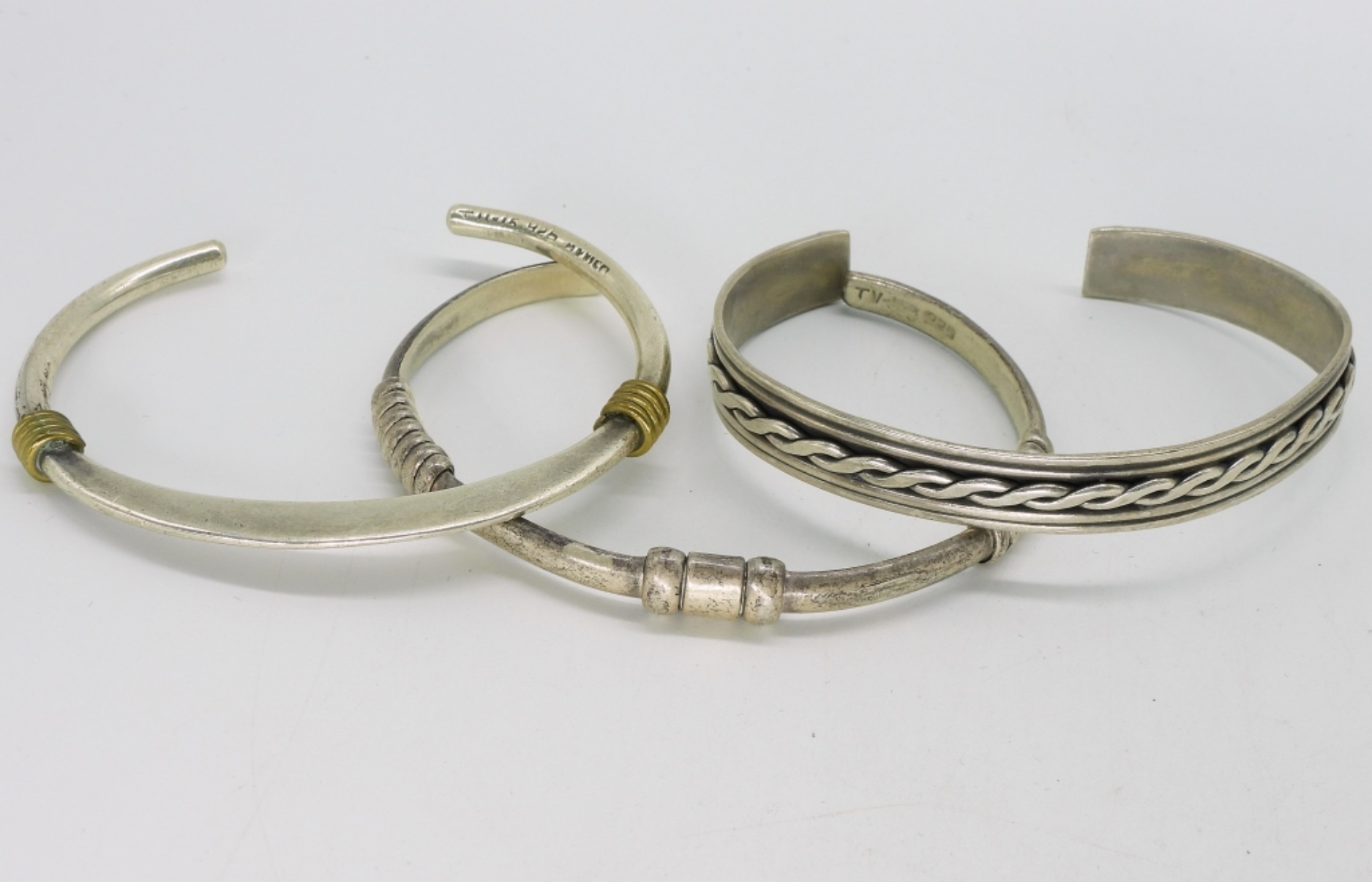 3 Sterling Cuff Bracelets. Taxco and two unmarked. (31.2 dwt) 6x4x2