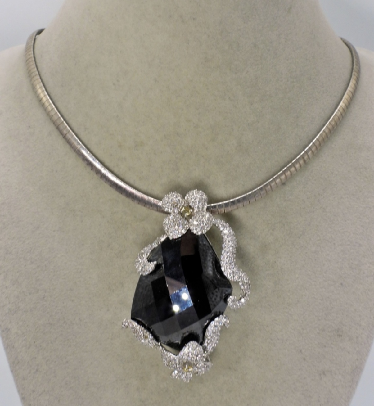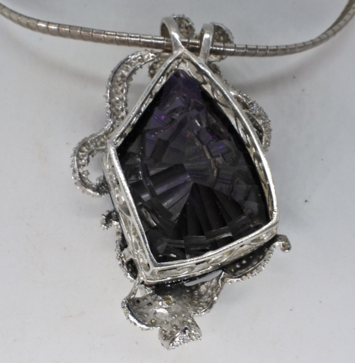 Huge Amethyst (probably simulated), rhinestone pendant (2.5″ x 2″). Sterling chain is 18″ long. Very Heavy (27 dwt)