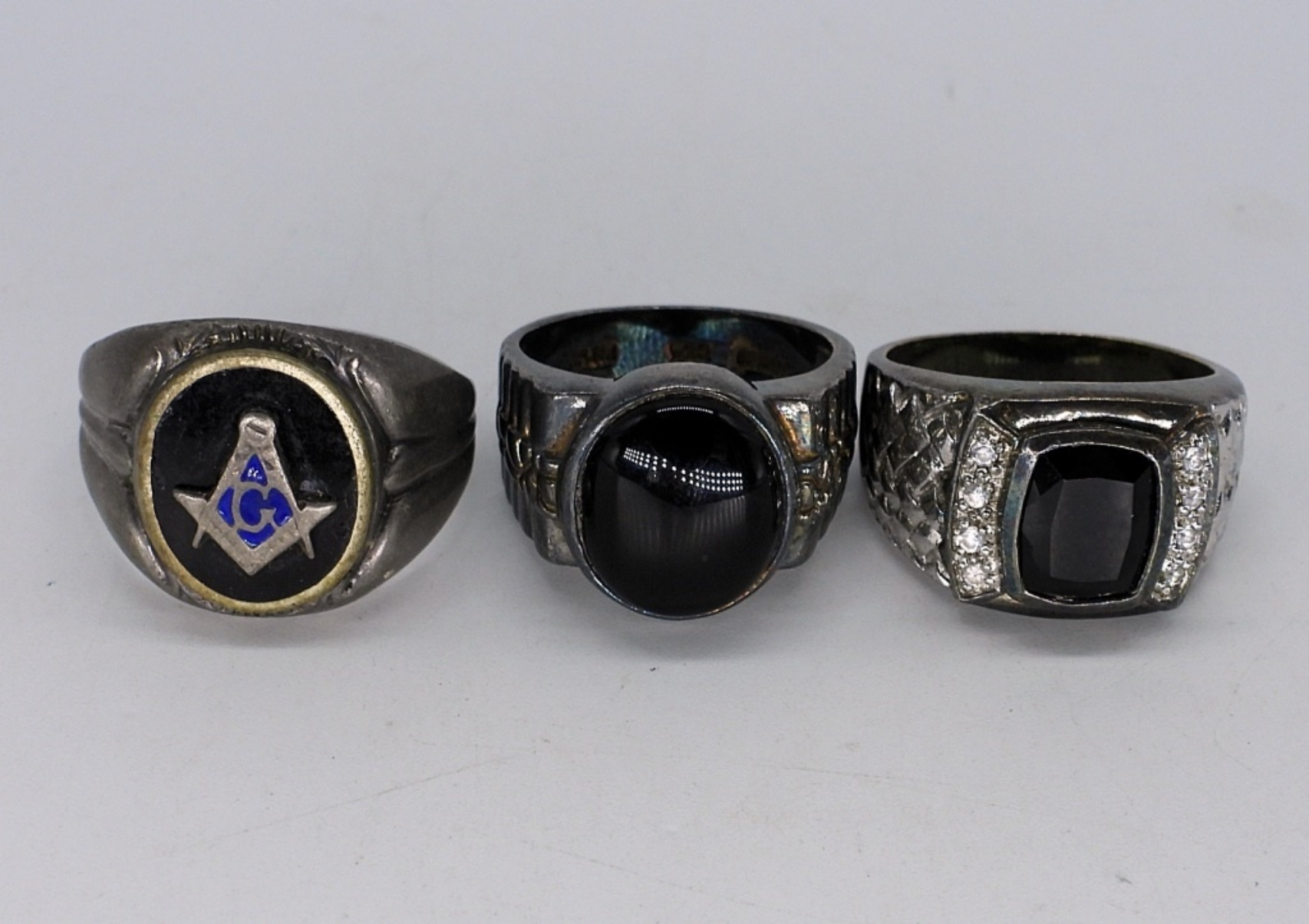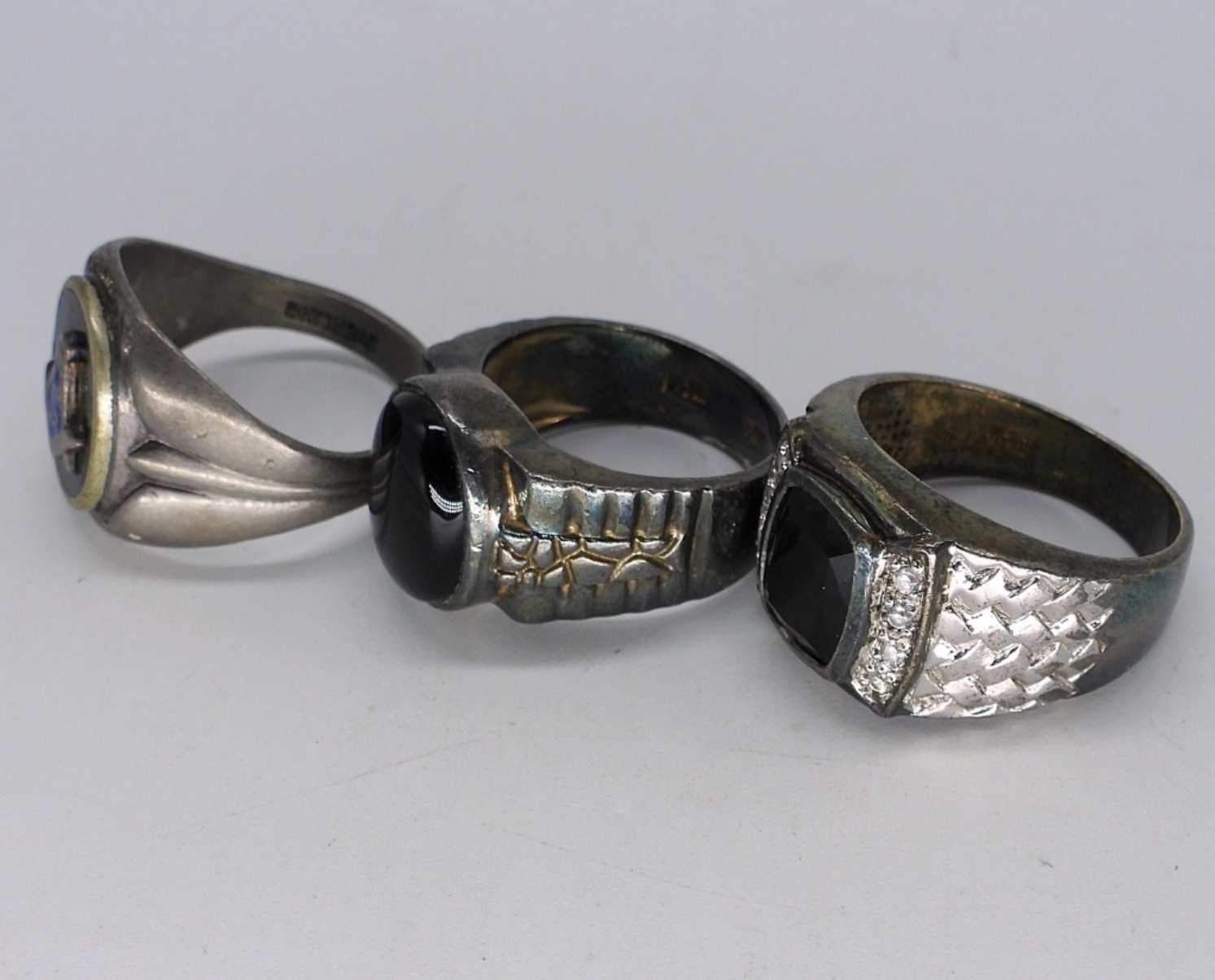 Three vintage sterling, large black onyx rings. Sizes 9, 10, 12. (19 dwt)
