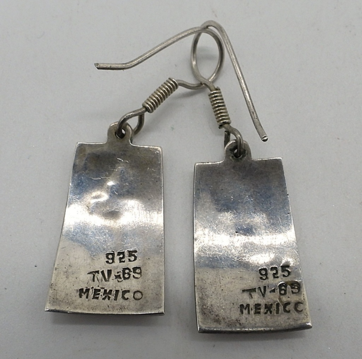 Two matching little girl pendants, sterling Taxco, 2″ long. One sterling chain, 18″ long. Pierced sterling, turquoise inlay earrings, 1.5″ long. (14.3 dwt)