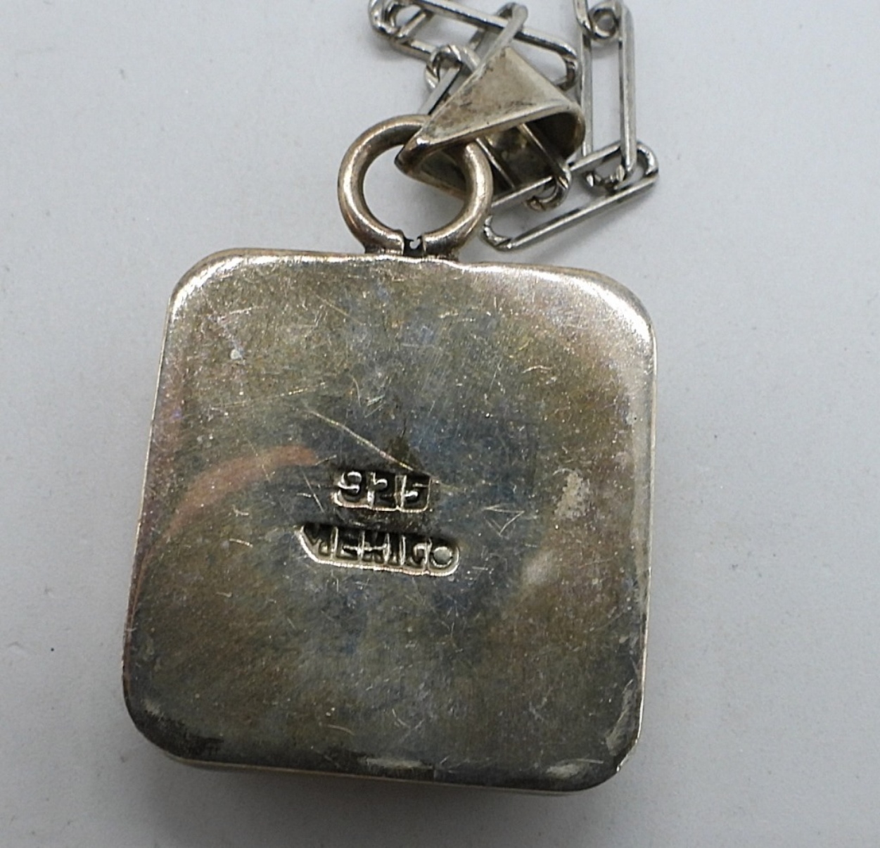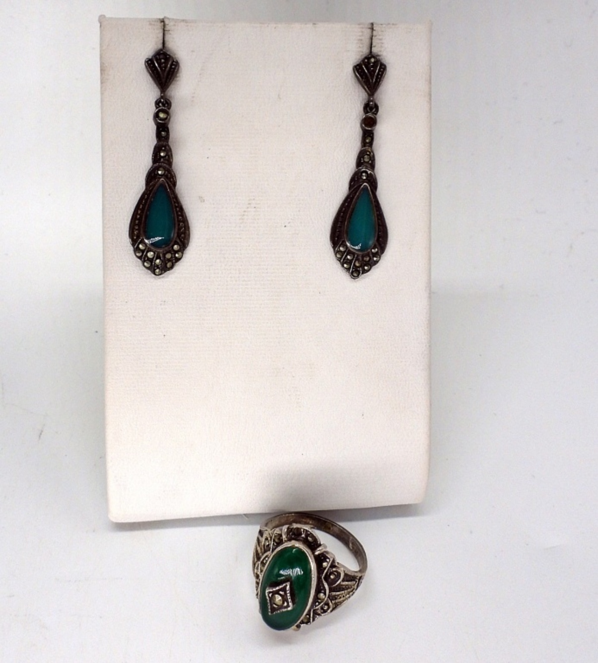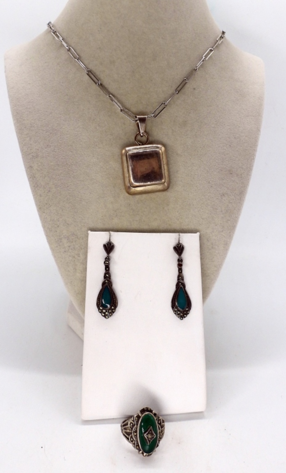 Green Onyx sterling ring, size 7. Pierced sterling earrings with green onyx and marcasite, 1.5″ long. Mexico sterling pendant on a 18″ chain. (15.2 dwt)