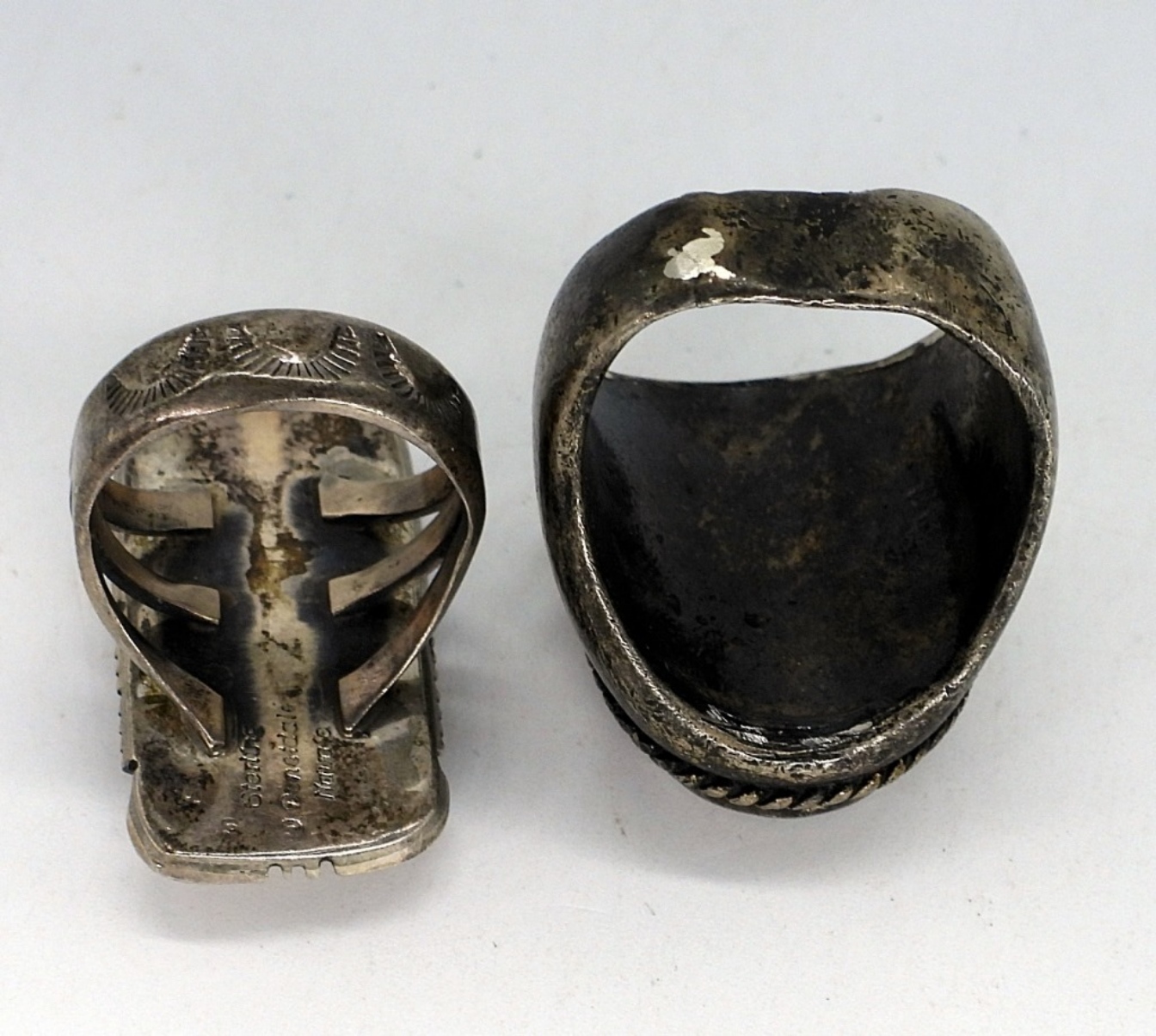 Two sterling rings with ribbon turquoise, mother of pearl gemstones. Largest ring is misshapen but can be fixed. Sizes 8 & 11.5-12. Larger ring has no markings. (27 dwt)