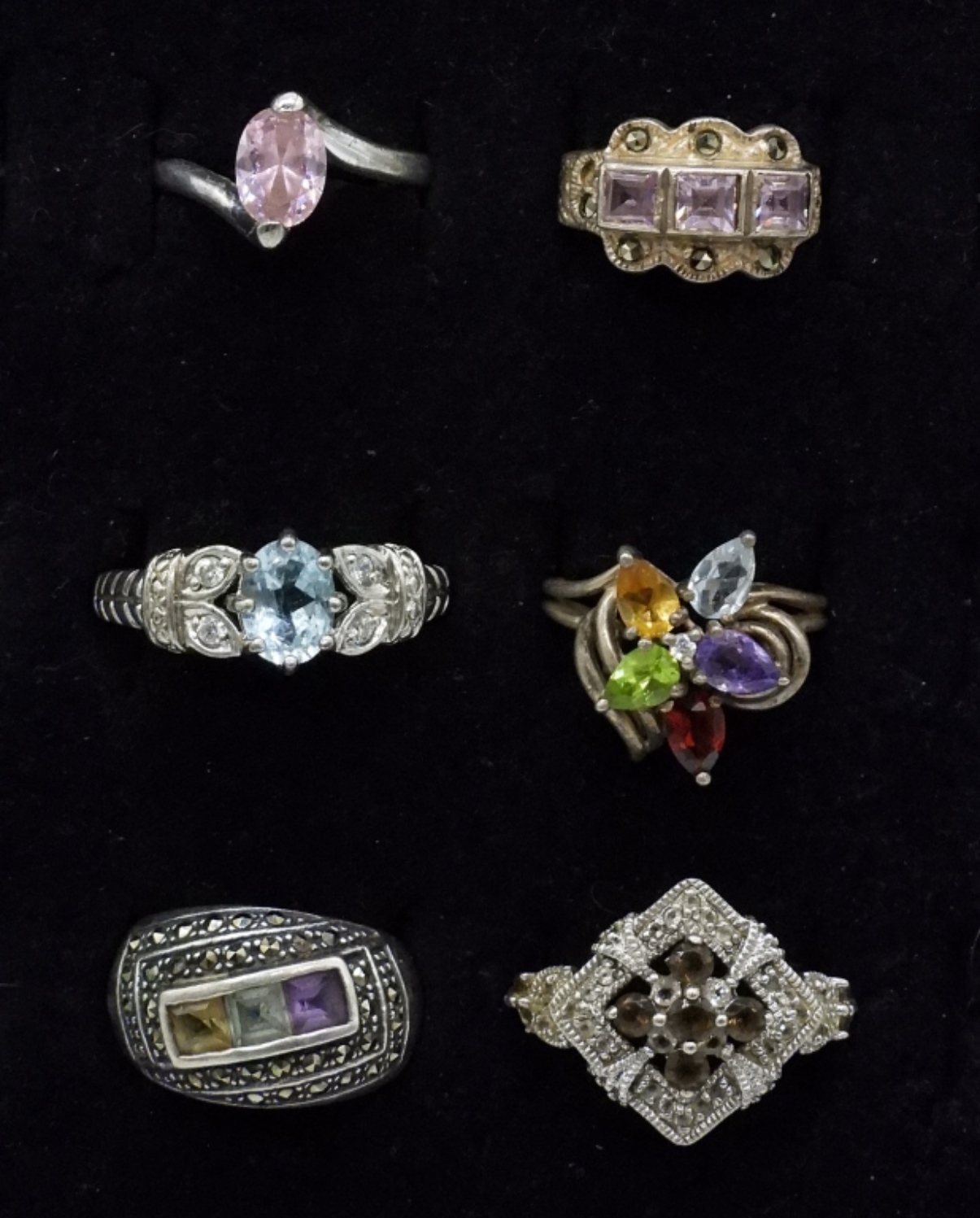 Six sterling gemstone fashion rings. Pink cz, Amethyst, Blue Topaz, Citrine, Garnet gemstones. Sizes 4-11 (17 dwt)