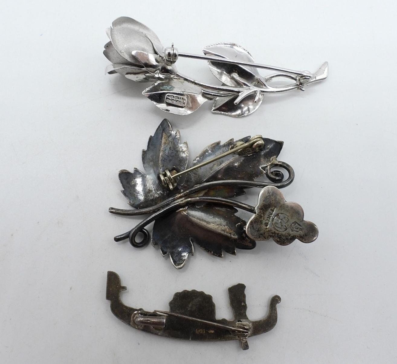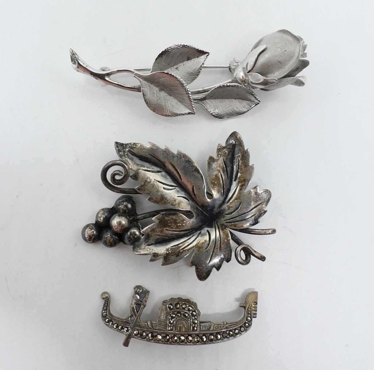 Damaso Gallegos “DG” Taxco Mexico sterling grape leaf pin, 2″ long. HSB sterling rose pin, 2.5″ long. Marcasite boat pin, 2″ wide. (13.2 dwt)