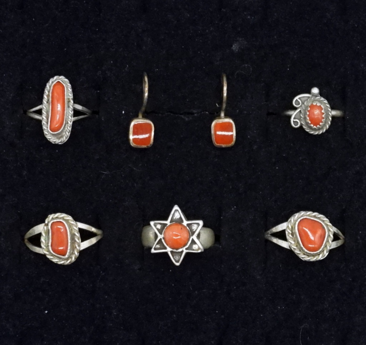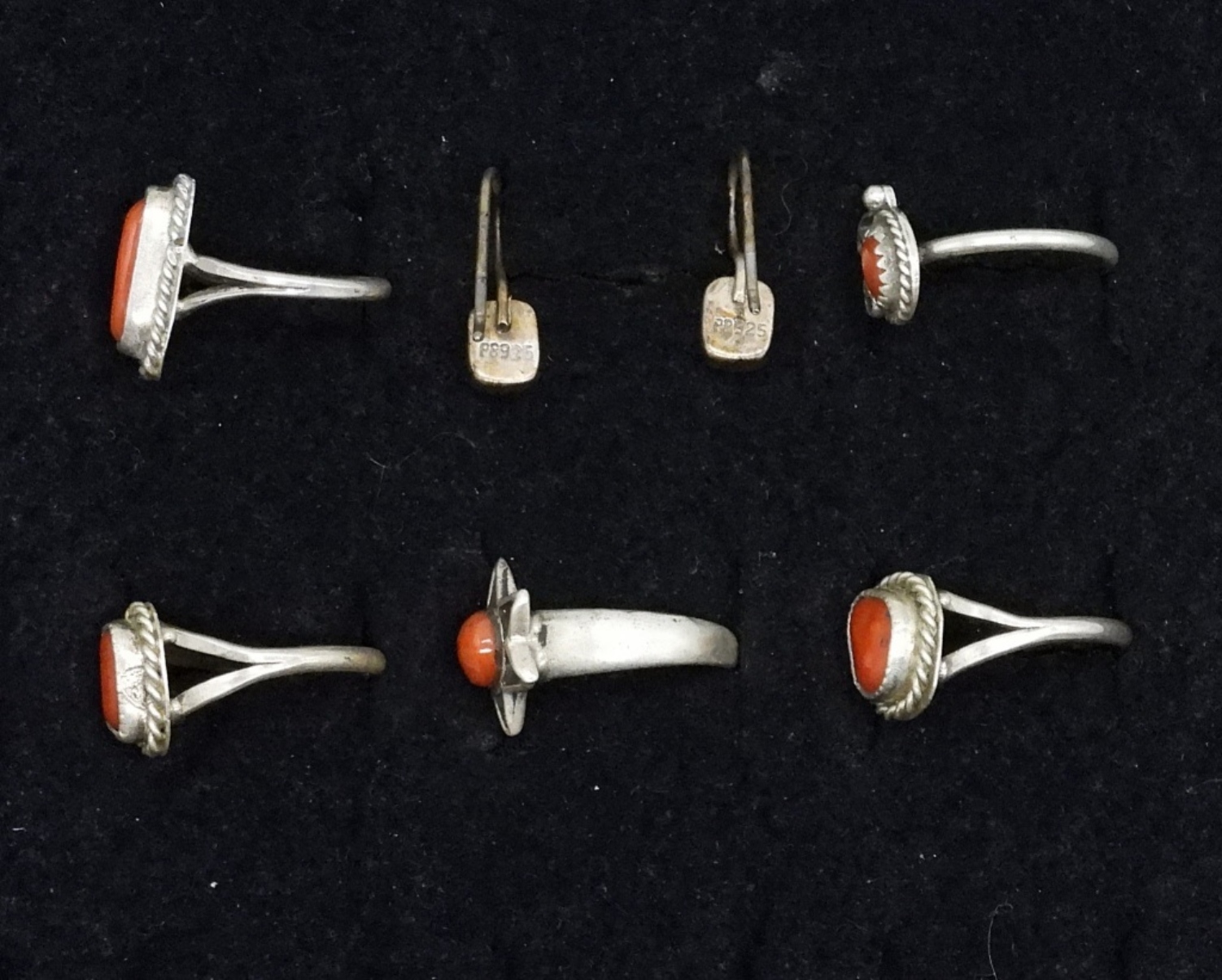 Five petite sterling red coral gemstone rings, sizes 3-7. Pierced earrings are 3/4″ long. (7 dwt)