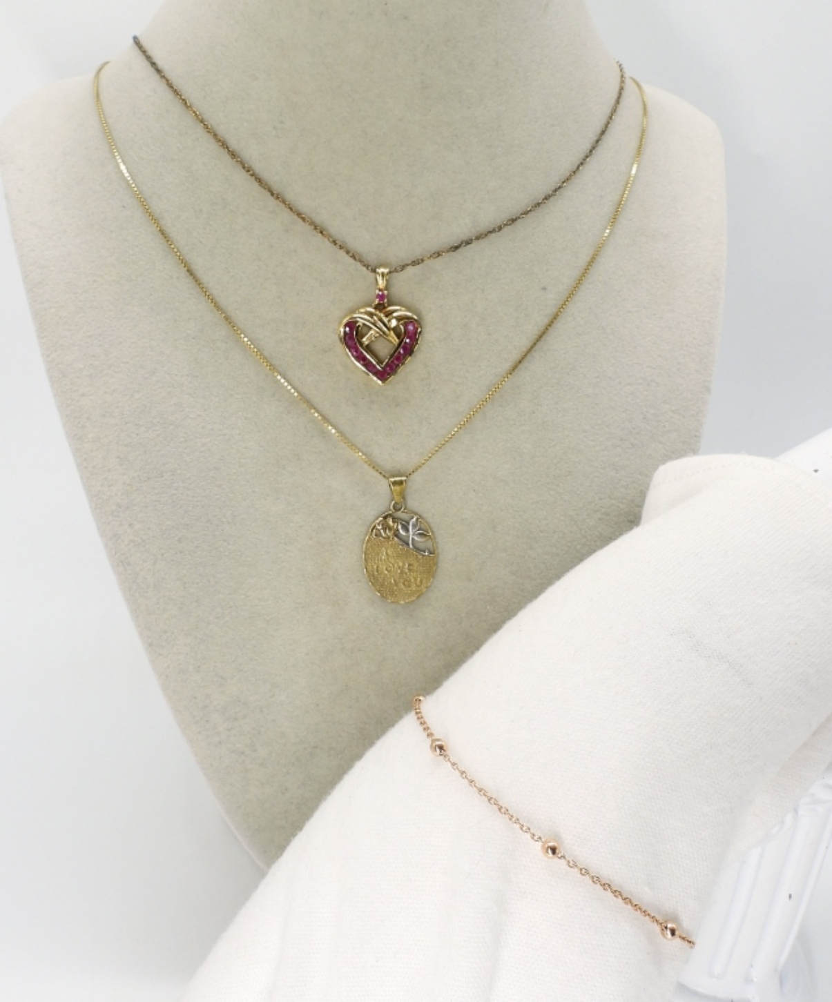 Two gold tone sterling necklaces, 15″ & 30″ long chains. Sterling gold tone bracelet, 7″ long. (6.4 dwt)