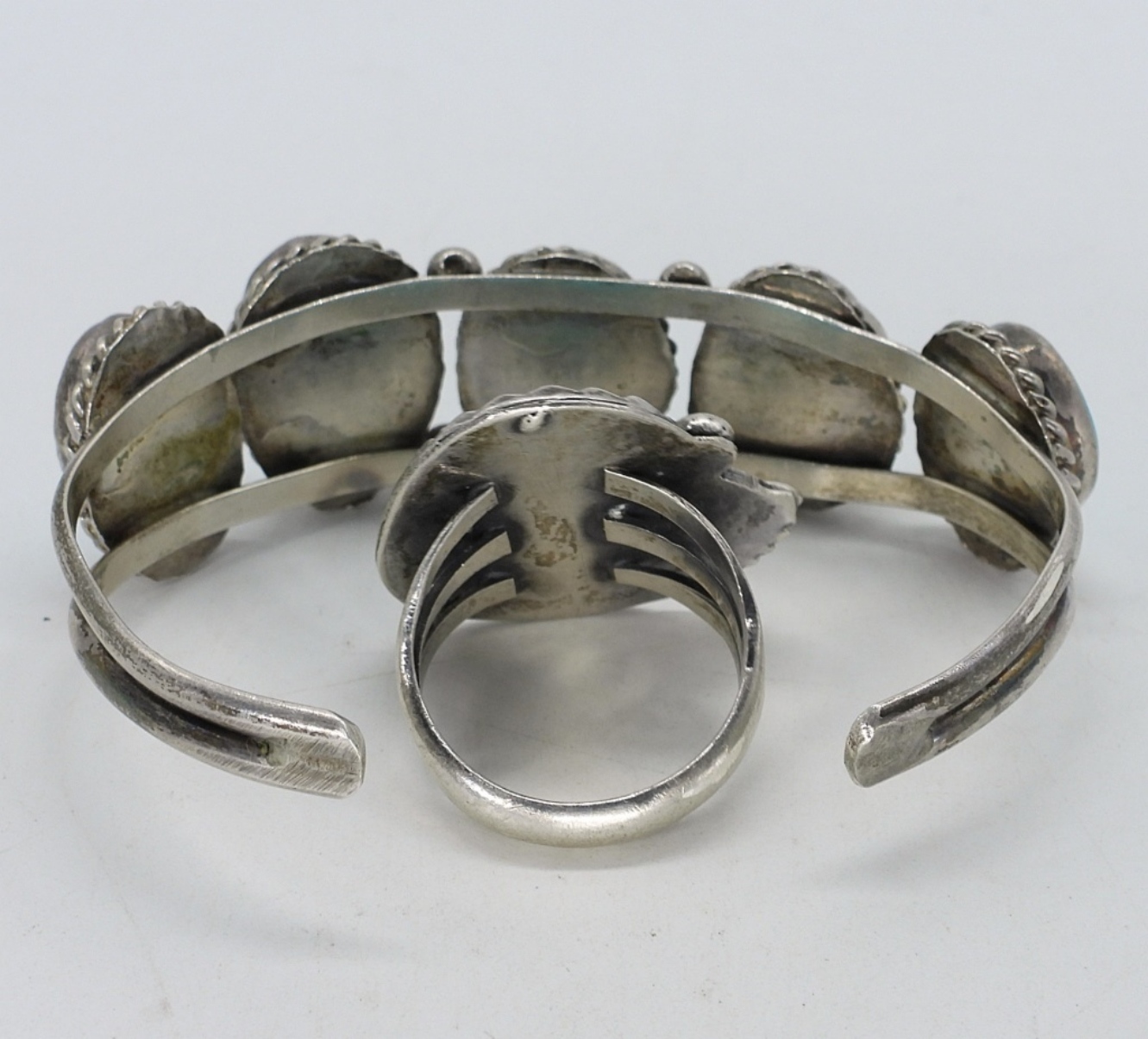 Vintage sterling turquoise cuff bracelet, 7″ around inside. Turquoise ring, size 8. (20 dwt)