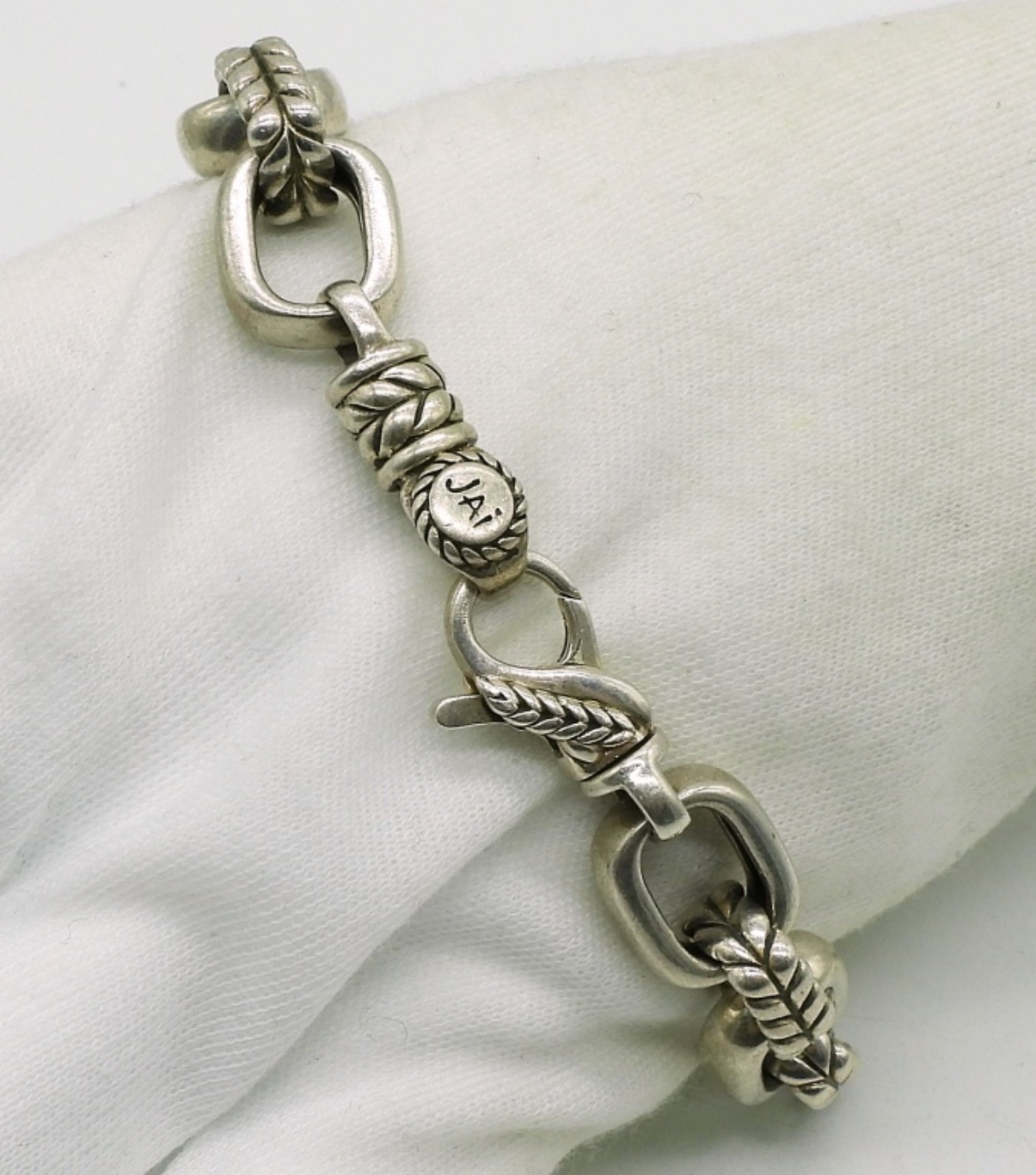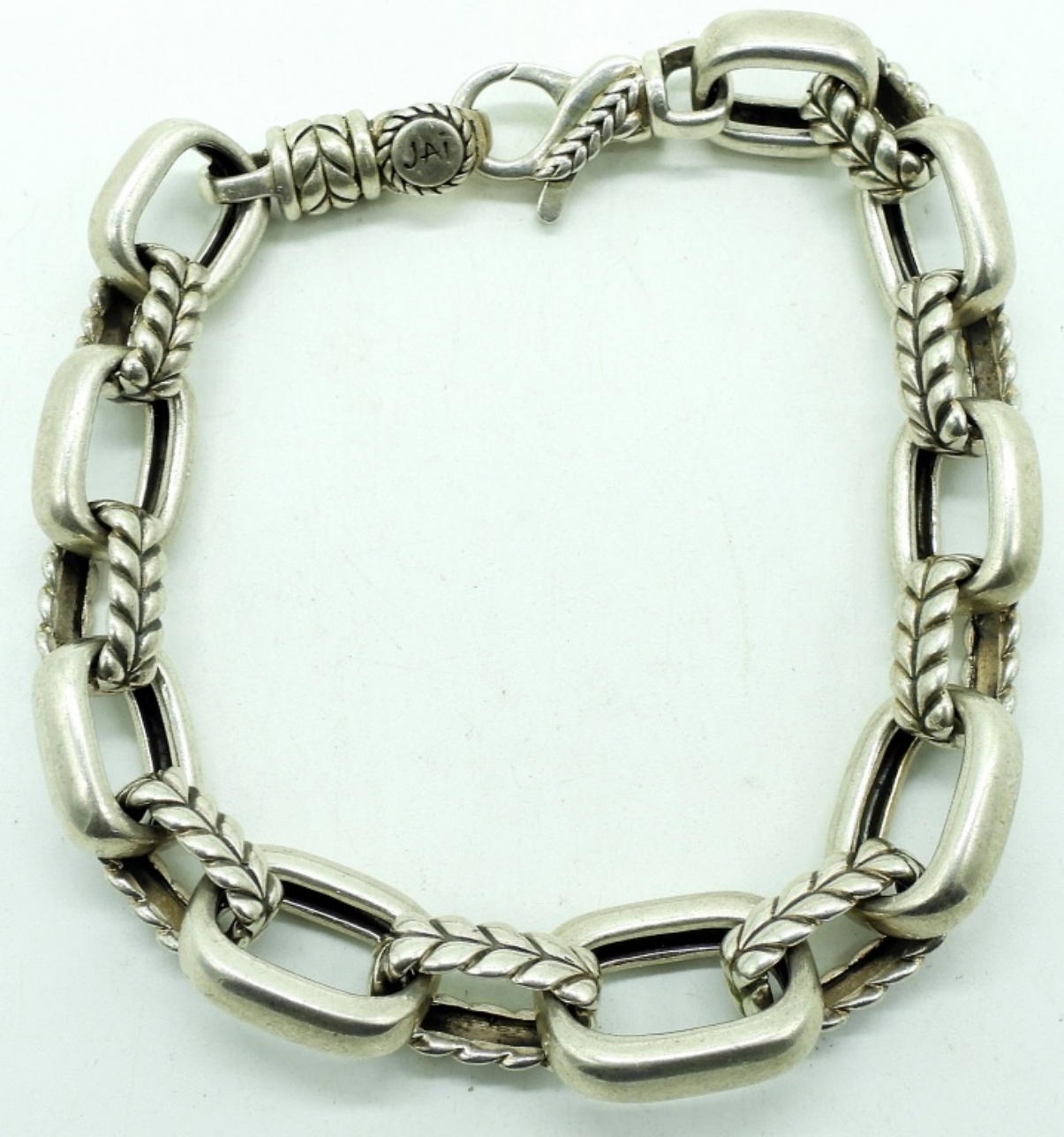 Heavy sterling fashion bracelet, 8.5″ long. Marked JAI 925. (27.6 dwt) (6x4x2)