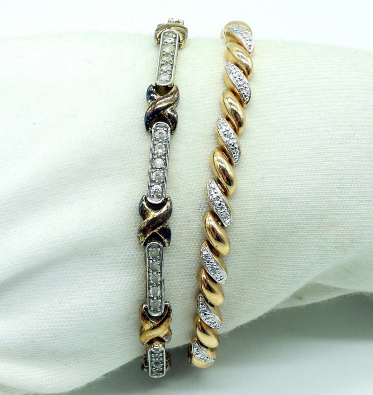 Two sterling gold tone, simulated diamond tennis bracelets. 7-7.5″ long. (18 dwt)