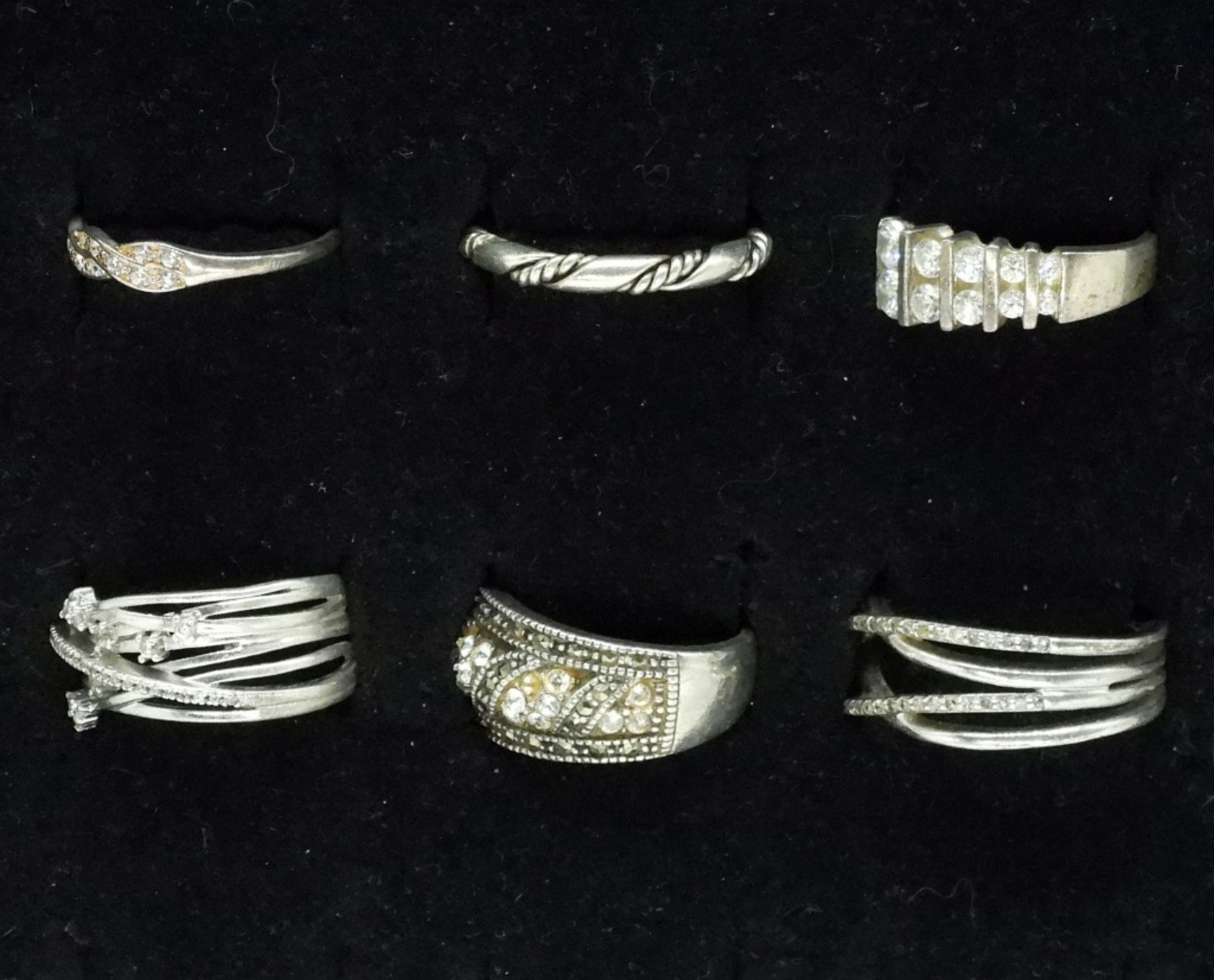 Six sterling, simulated diamond rings. Sizes 5-9 (17.4 dwt) (6x4x2)