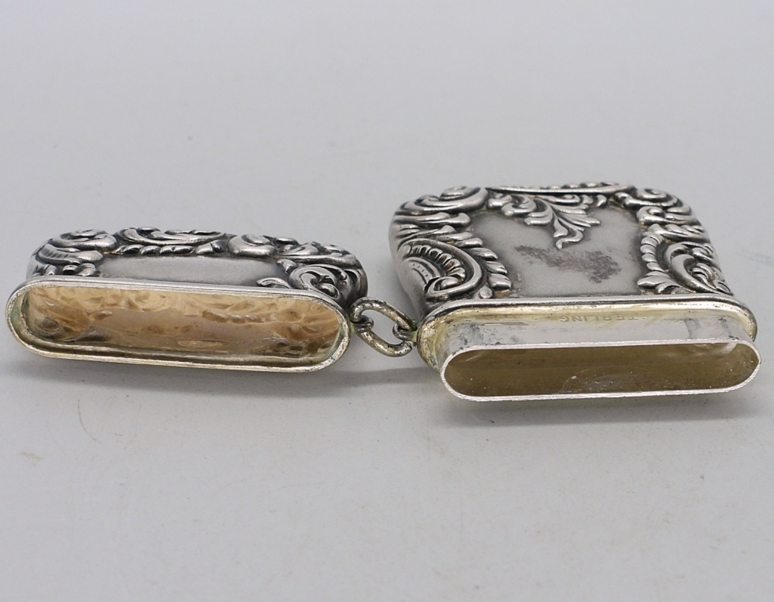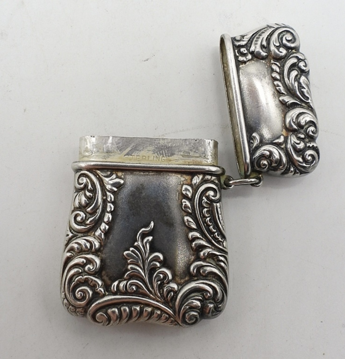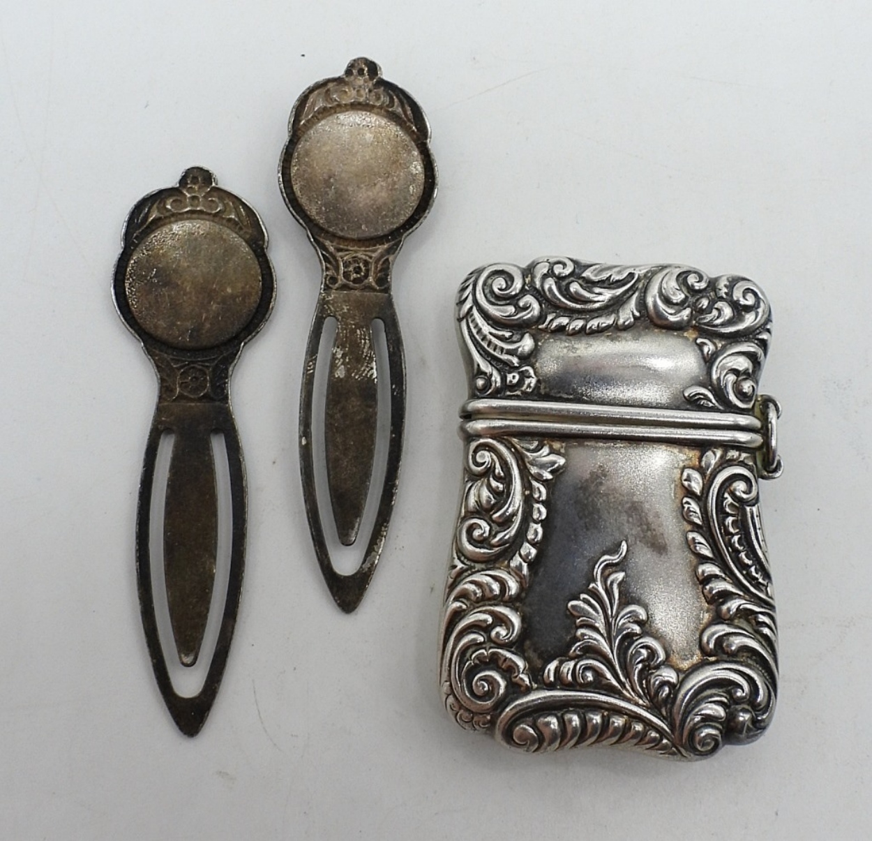 One sterling vintage match case, 2″ long, 1″ wide. Two sterling book marks, 2″ long, 1/2″ wide. (14 dwt)