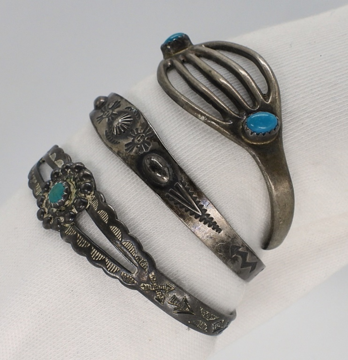 Three petite sterling cuff bracelets with turquoise gemstones. 5″. (16.4 dwt)
