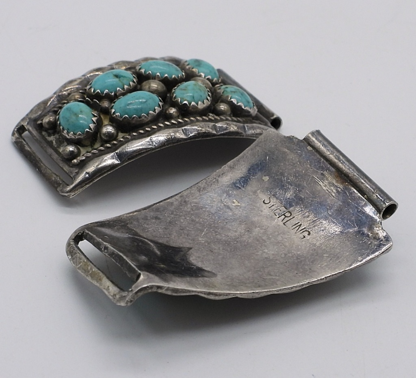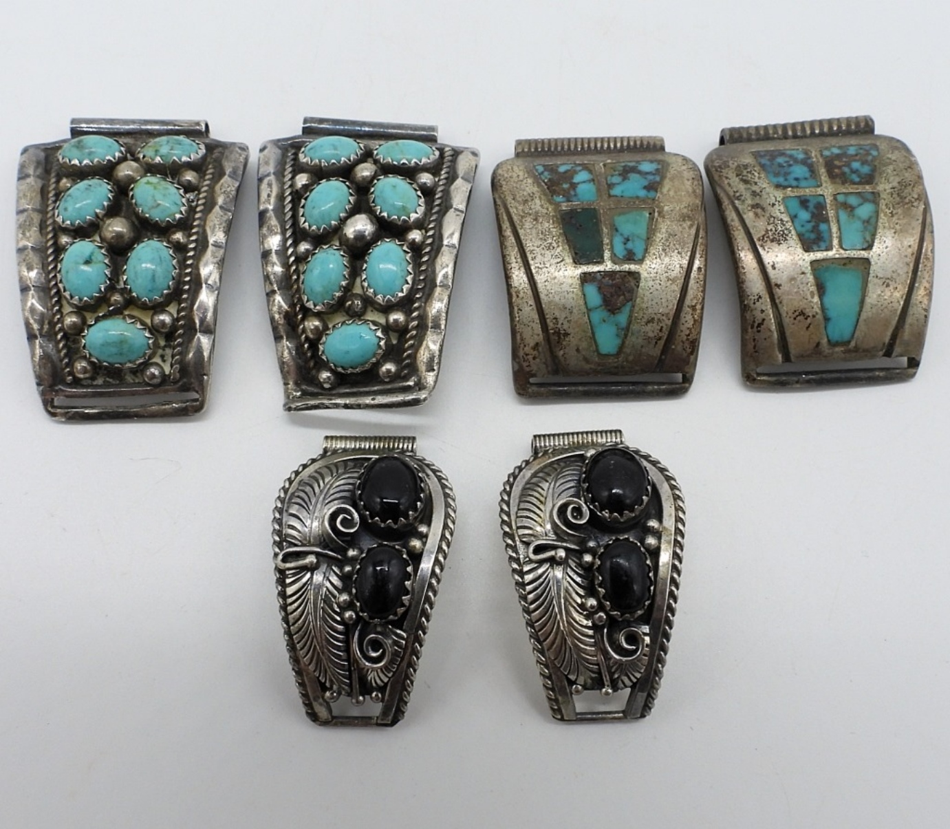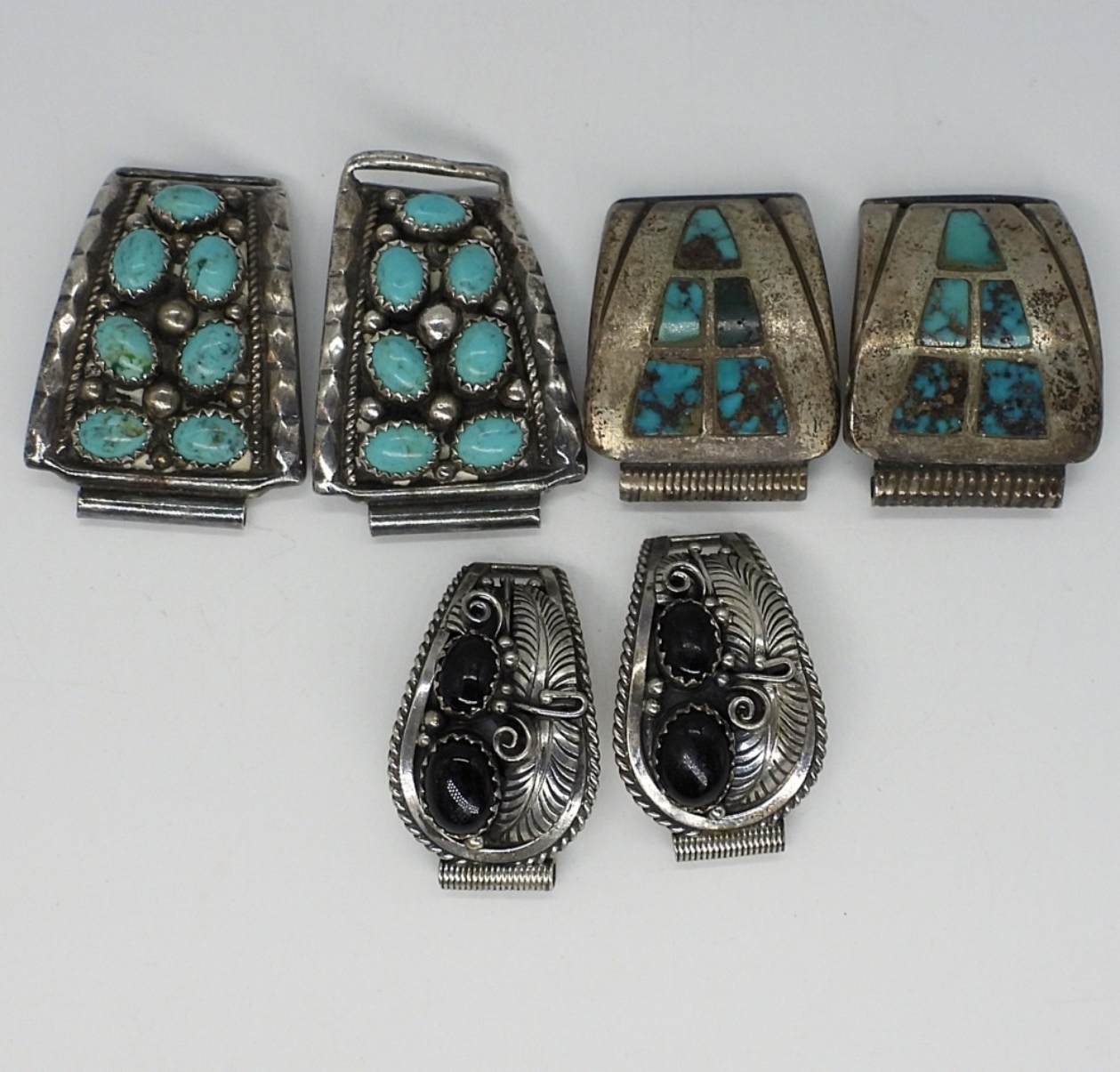 Three pair of sterling watch tips, Native American, Turquoise and Black Onyx. One set has a bend end, see photos! 1″ -1.5″ long. (33 dwt)