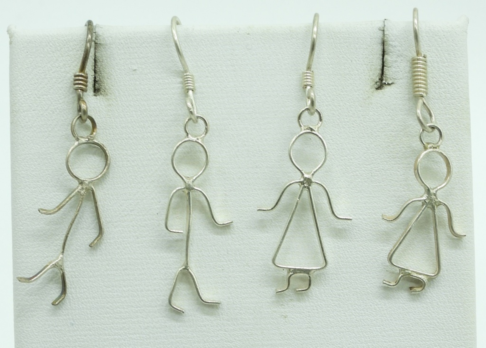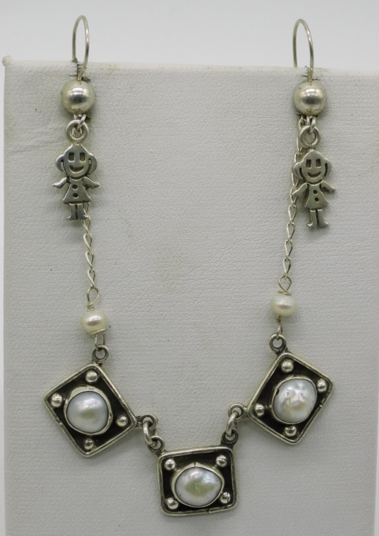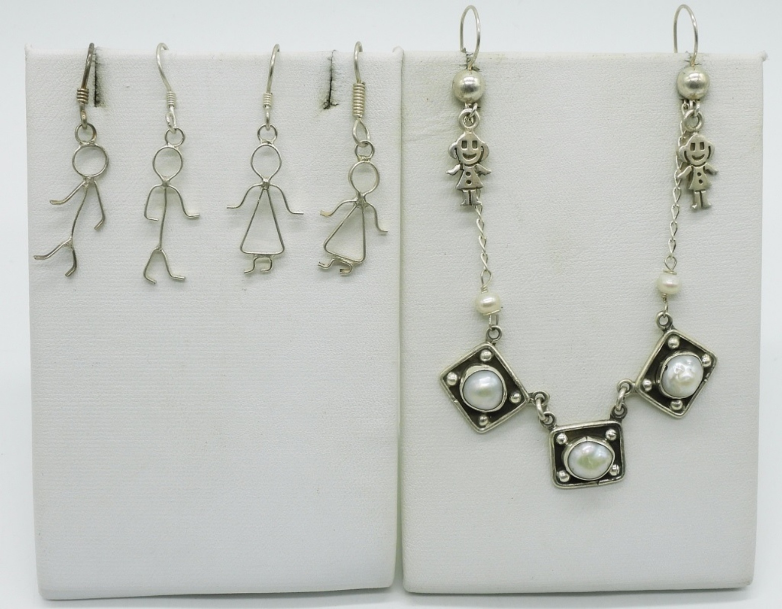 Sterling pearl necklace, 16″ long. Three pair of sterling pierced earrings, 1″ – 1.5″ long. (6.2 dwt) (6x4x2)