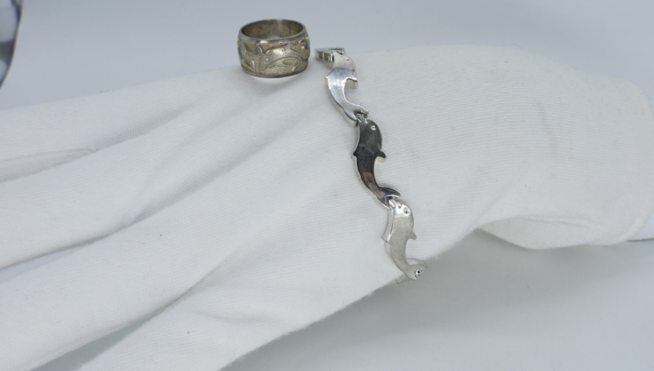 Sterling bracelet 7″ long and ring size 4. Dolphin design. (14.9 dwt)