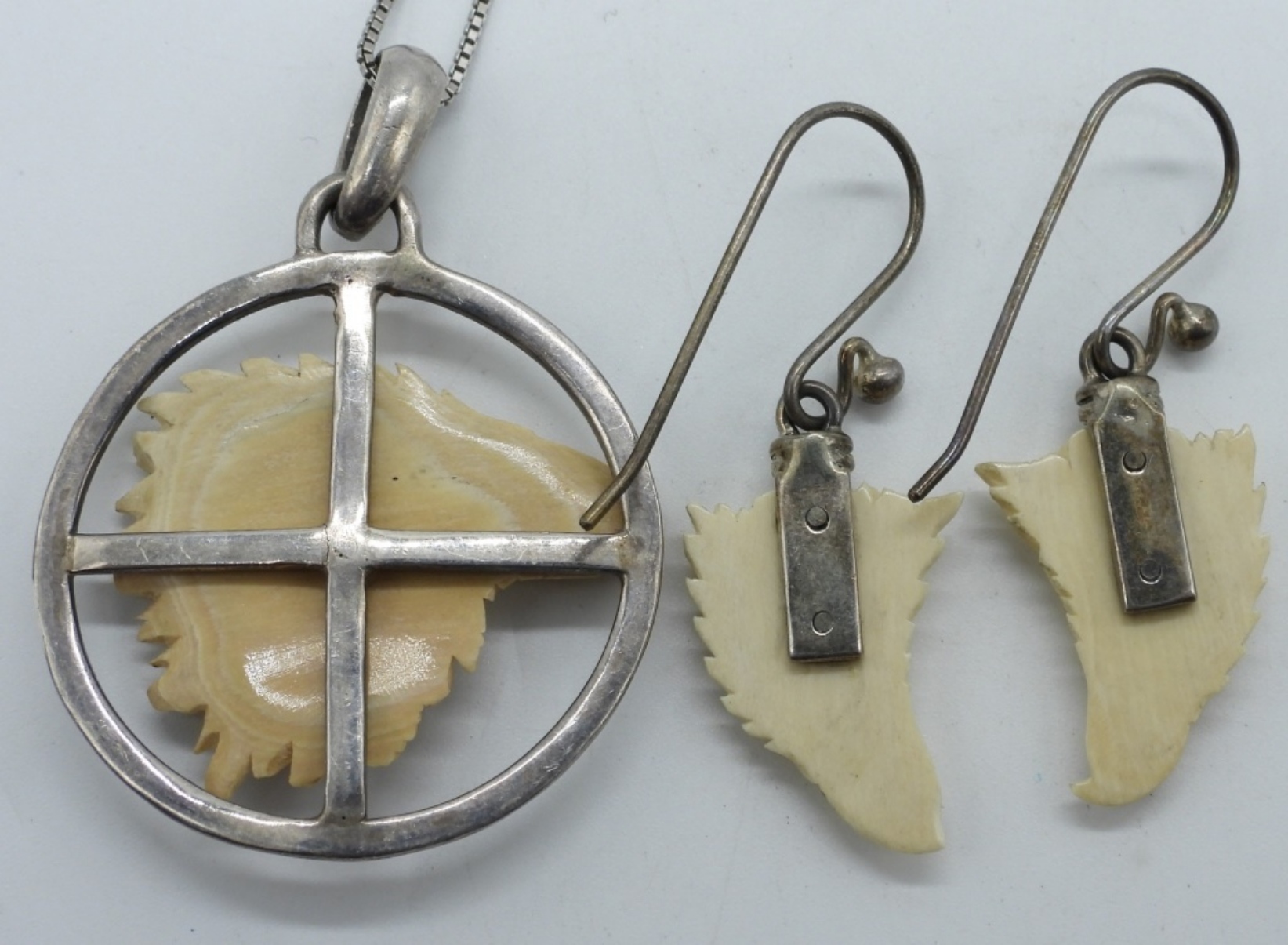 Vintage carved eagle head pendant, on an 18″ sterling chain. Matching pierced earrings, 1.5″ long. (5.5 dwt)