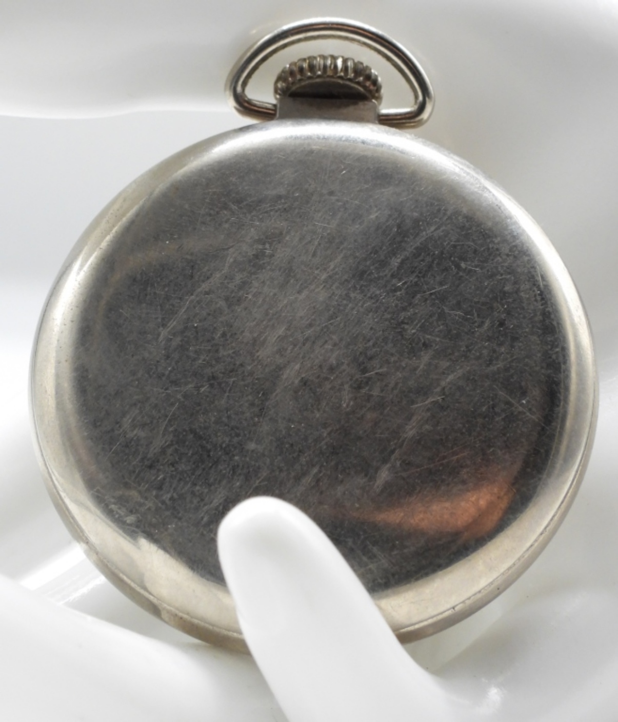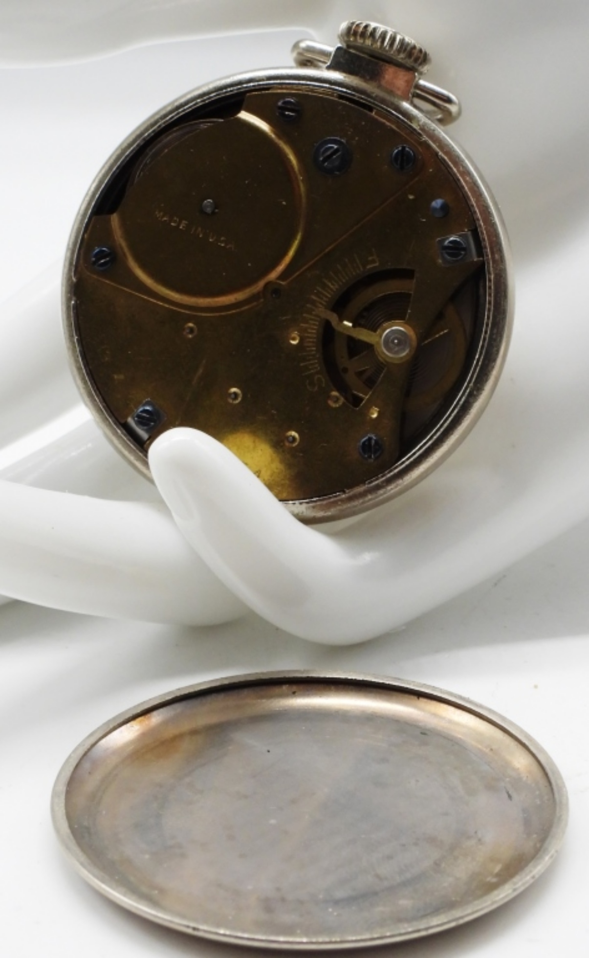 This is an open-faced watch with a white face and silver/chrome case. Watches are not verified, authenticated, or tested in running condition unless specified.