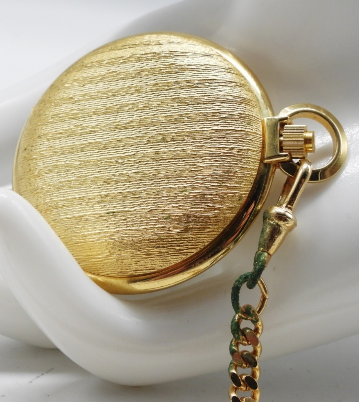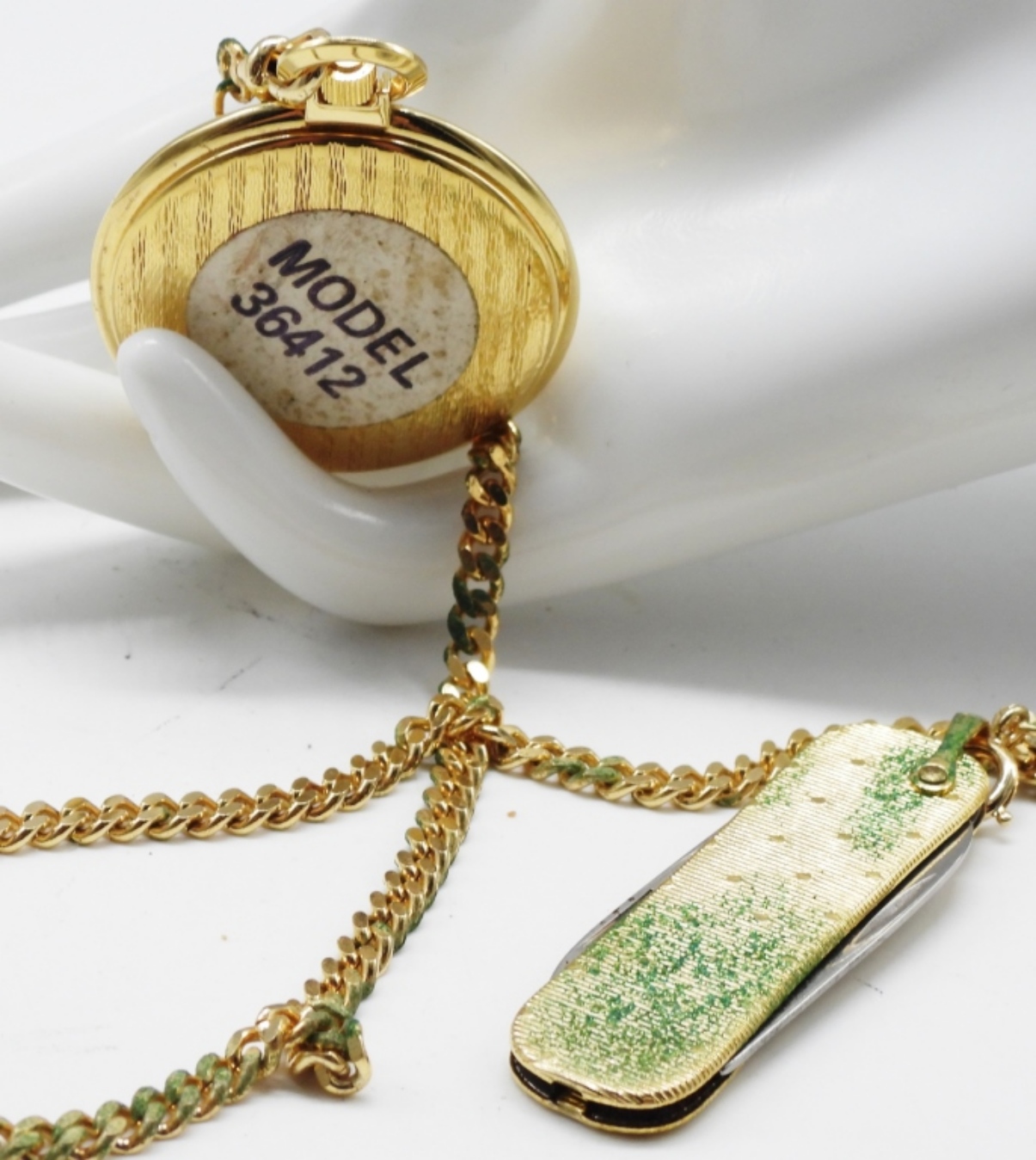Works! This beautiful gold-tone pocket watch comes with a chain and a gentleman’s knife. (has some type of paint on the chain.) Watches are not verified, authenticated, or tested in running condition unless specified.
