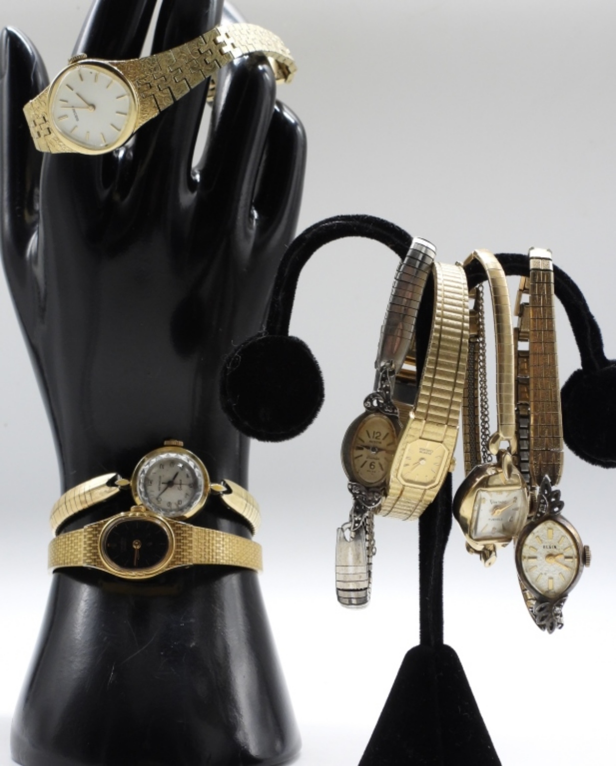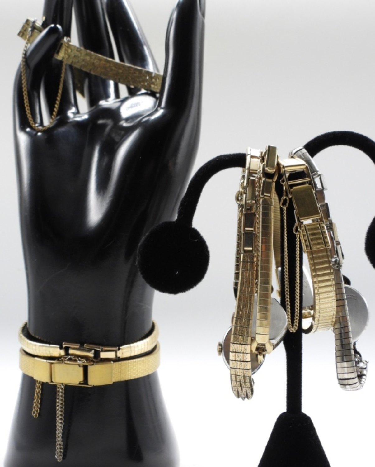 All different styles, gold-tone. Clasp bands with a catch chain. Some brands: Austin, Wittnauer, Seiko. Watches are not verified, authenticated, or tested in running condition unless specified.