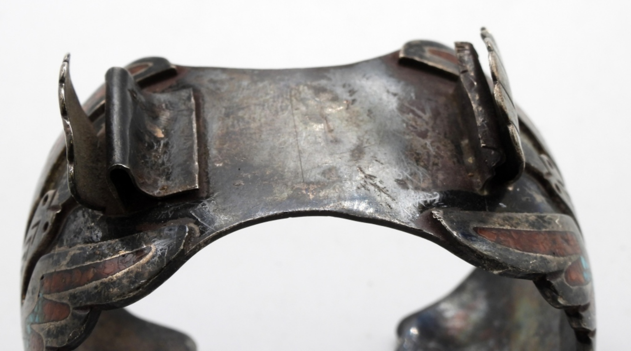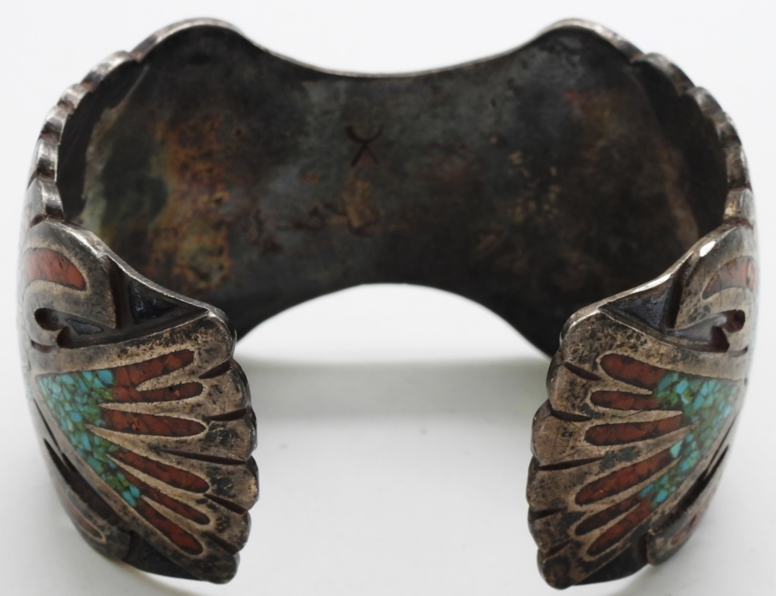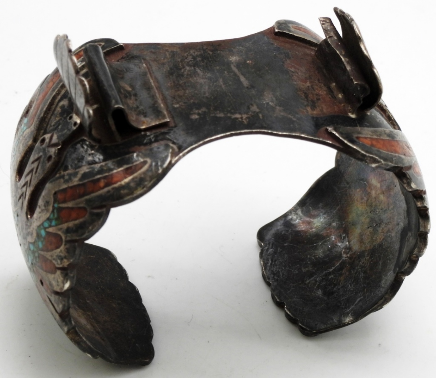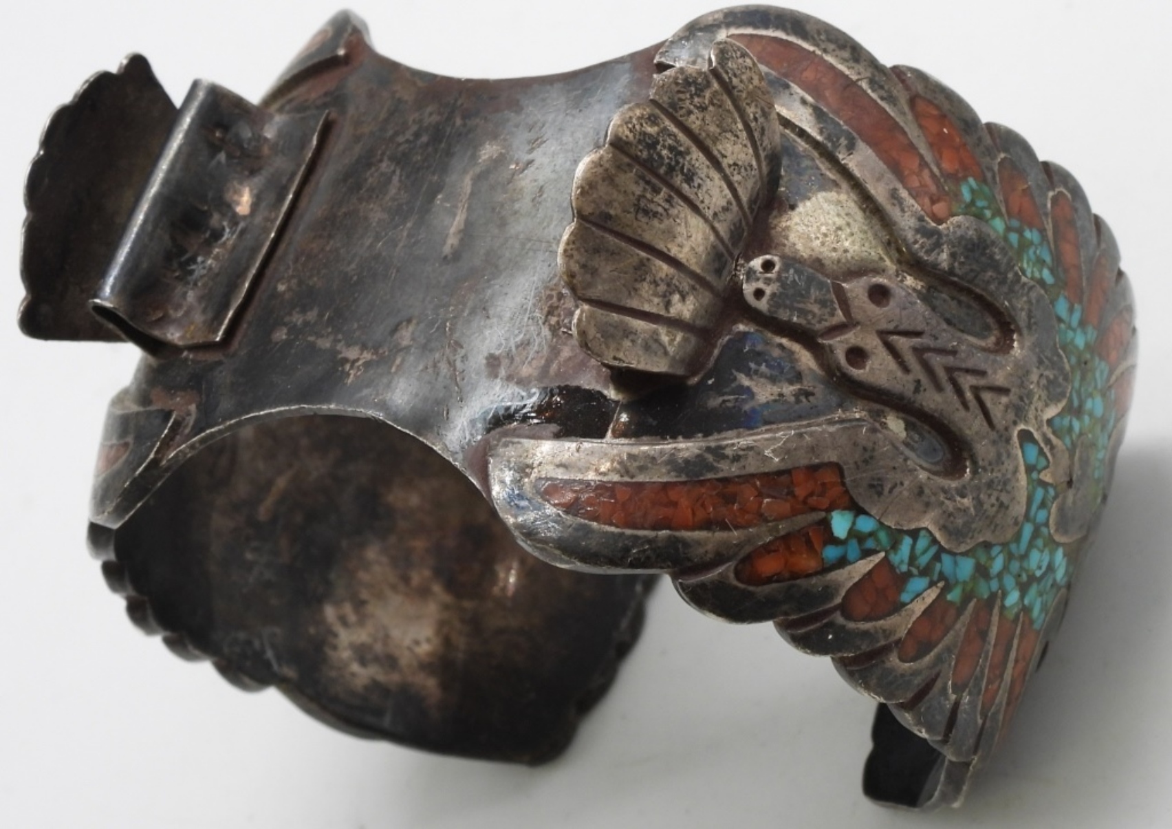 Coral and Turquoise crushed inlay. The clasp to hold one side is broken, but it does look like it can be repaired. Watches are not verified, authenticated, or tested in running condition unless specified.