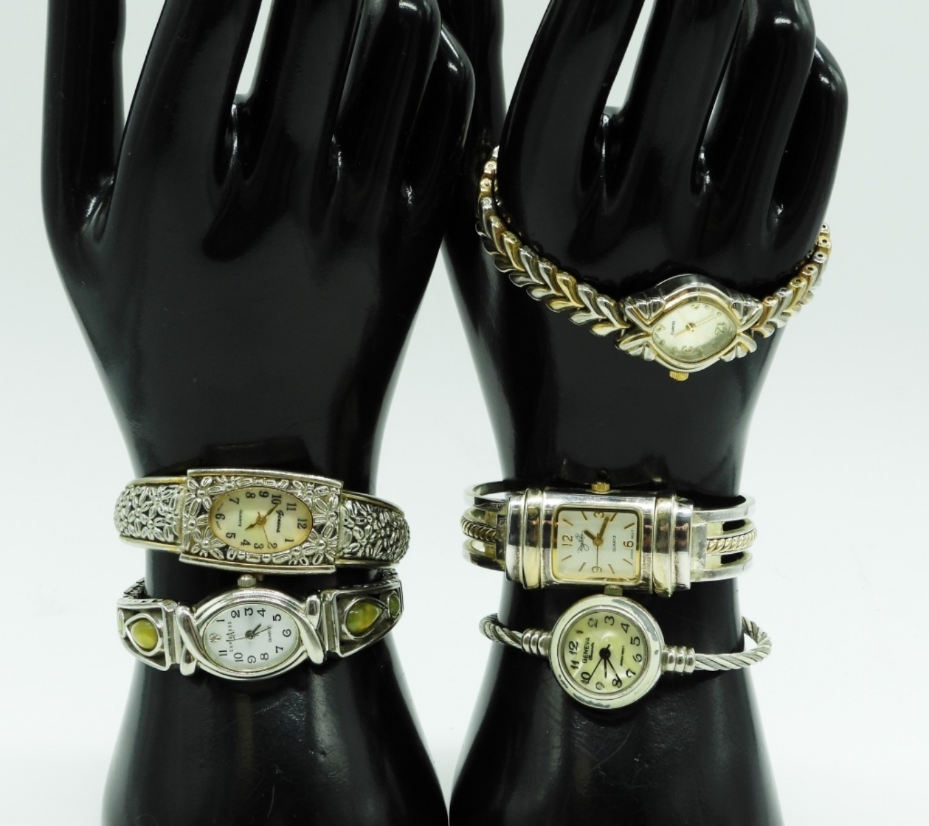 3- cuff bands, 1- clasp, 1-stretchy. Watches are not verified, authenticated, or tested in running condition unless otherwise specified.