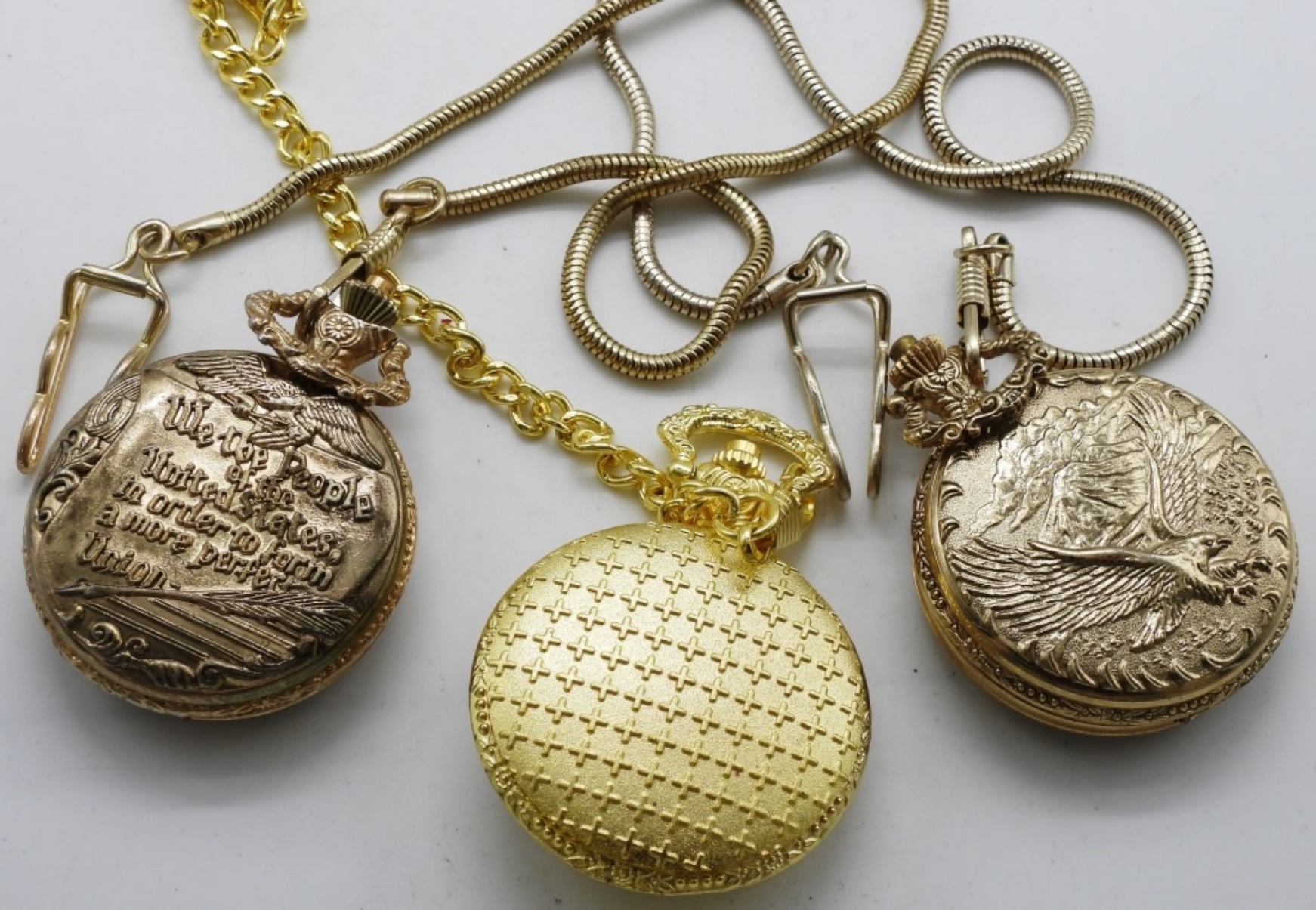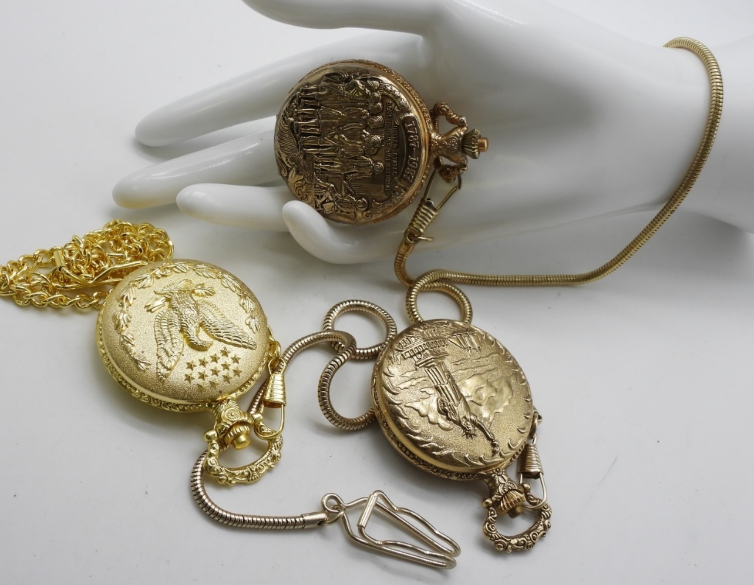Gold-tone. 1- Limited Edition Commemorative State of Liberty- Quartz. 1- Constitution Bicentennial 1787-1987 from Elegance- Antimagnetic, and 1- Eagle Japan Movement. Watches are not verified, authenticated, or
