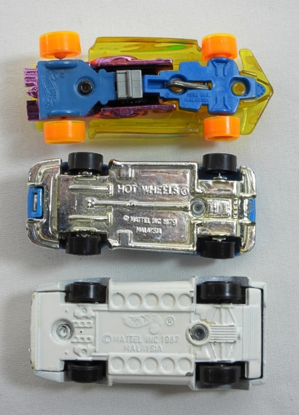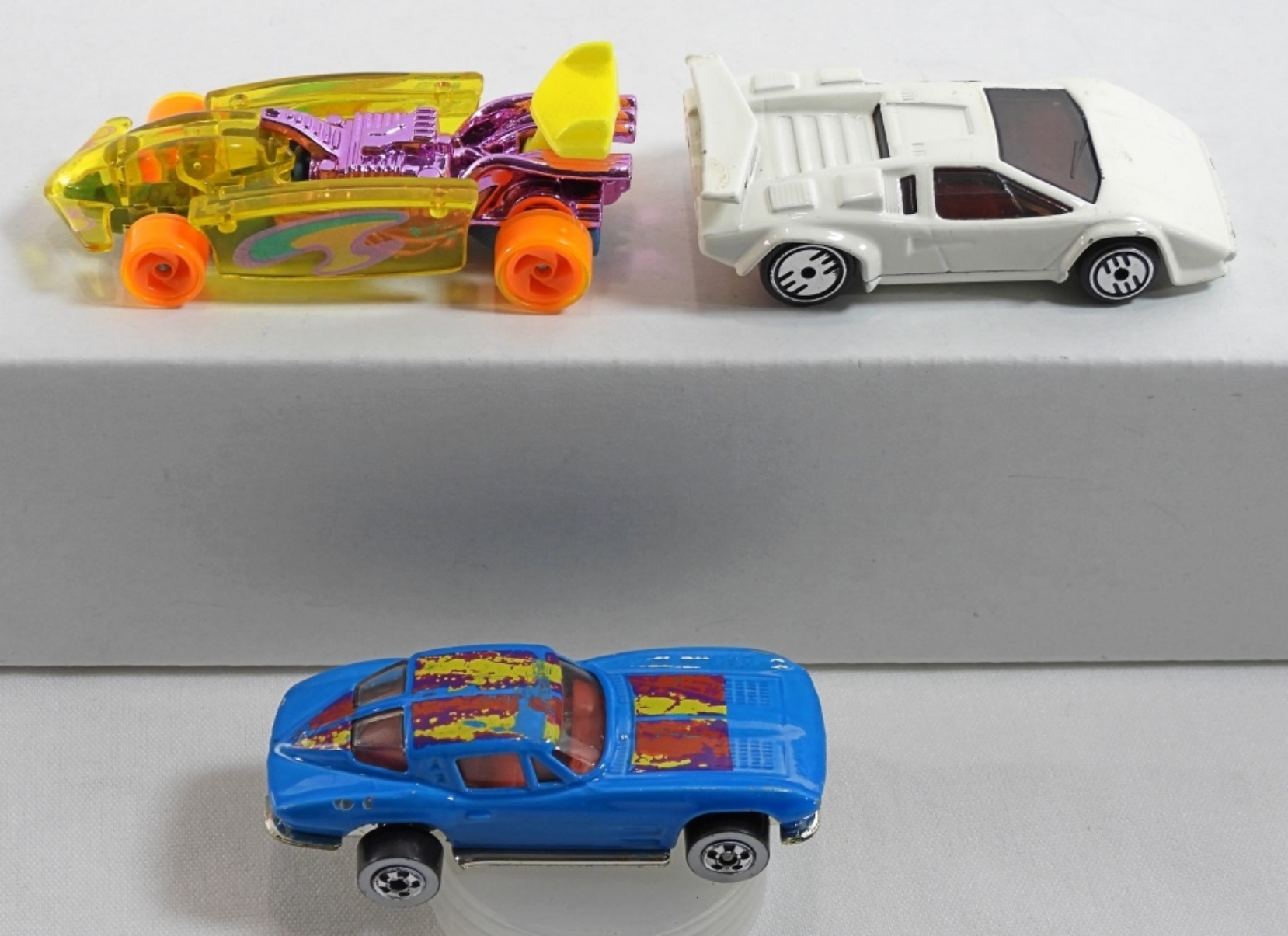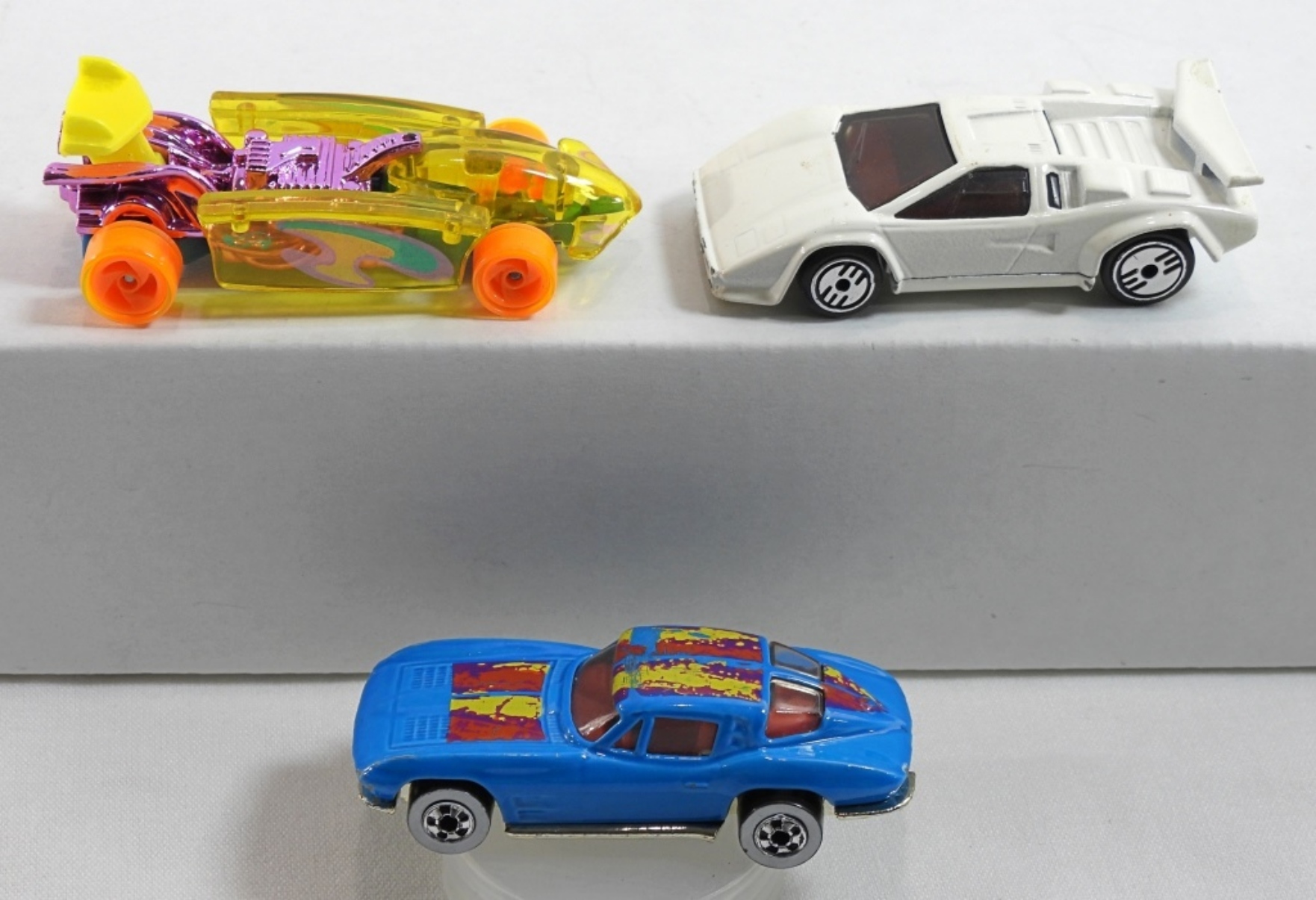 (3) Variety racing Hot Wheels- 1979 Blue Corvette, 1994 Orange Top Speed. 1987 Lamborghini Countach. All the cars are in fair to good condition, pre owned.