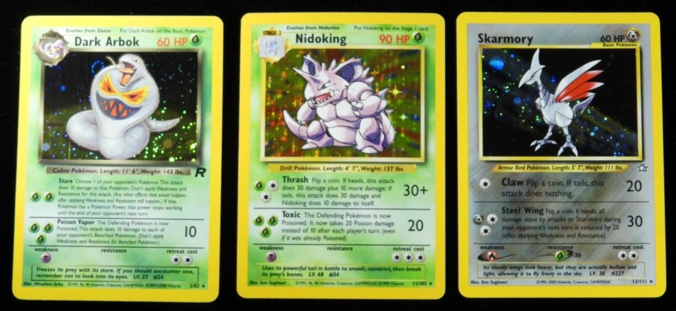 Neo Genesis 13/111 2000 Sharmory Holo 60HP. Nidoking 11/102 1999 Holo Rare Stage 2 90HP. Dark Arbok 2/82 2000 Holo Rare Stage 1 60 HP
