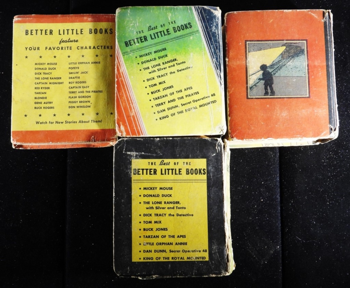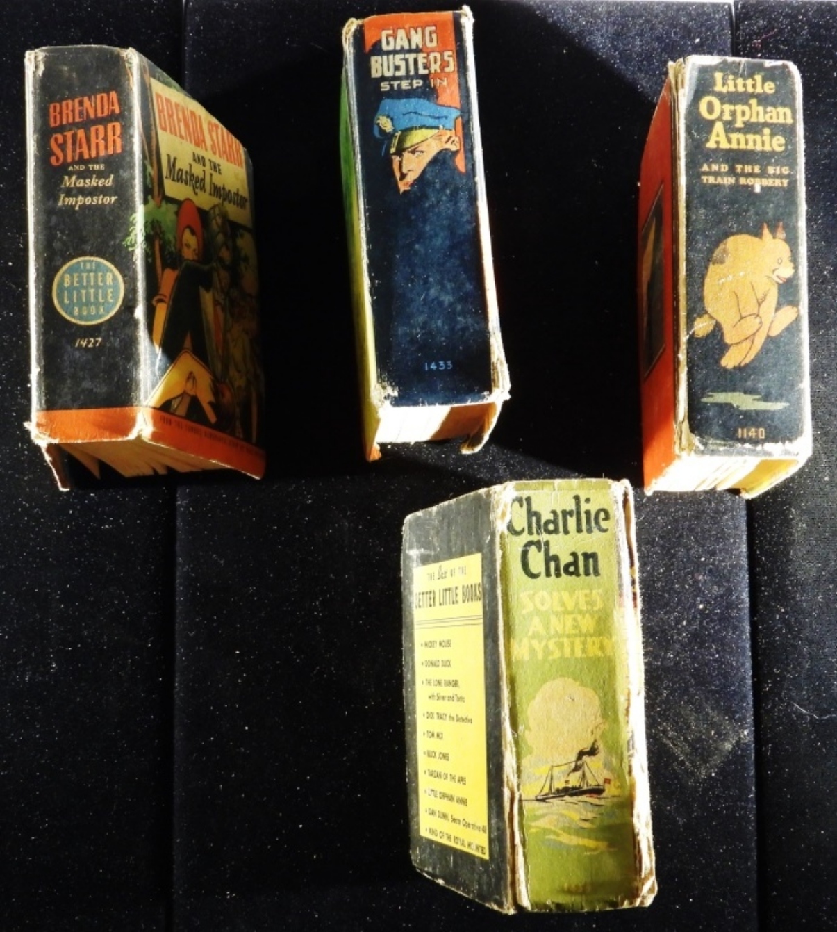 1) Brenda Starr And The Masked Impostor. 2) Little Orphan Annie and the Big Train Robbery(there are loose pages). 3) Gang Busters Step In. 4) Charlie Chan Solves A New Mystery (The spine is ripped)